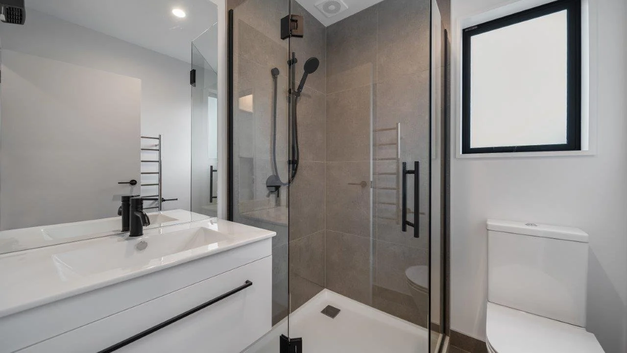 Modern bathroom tiled in a concrete look, paired with black plumbing fixtures