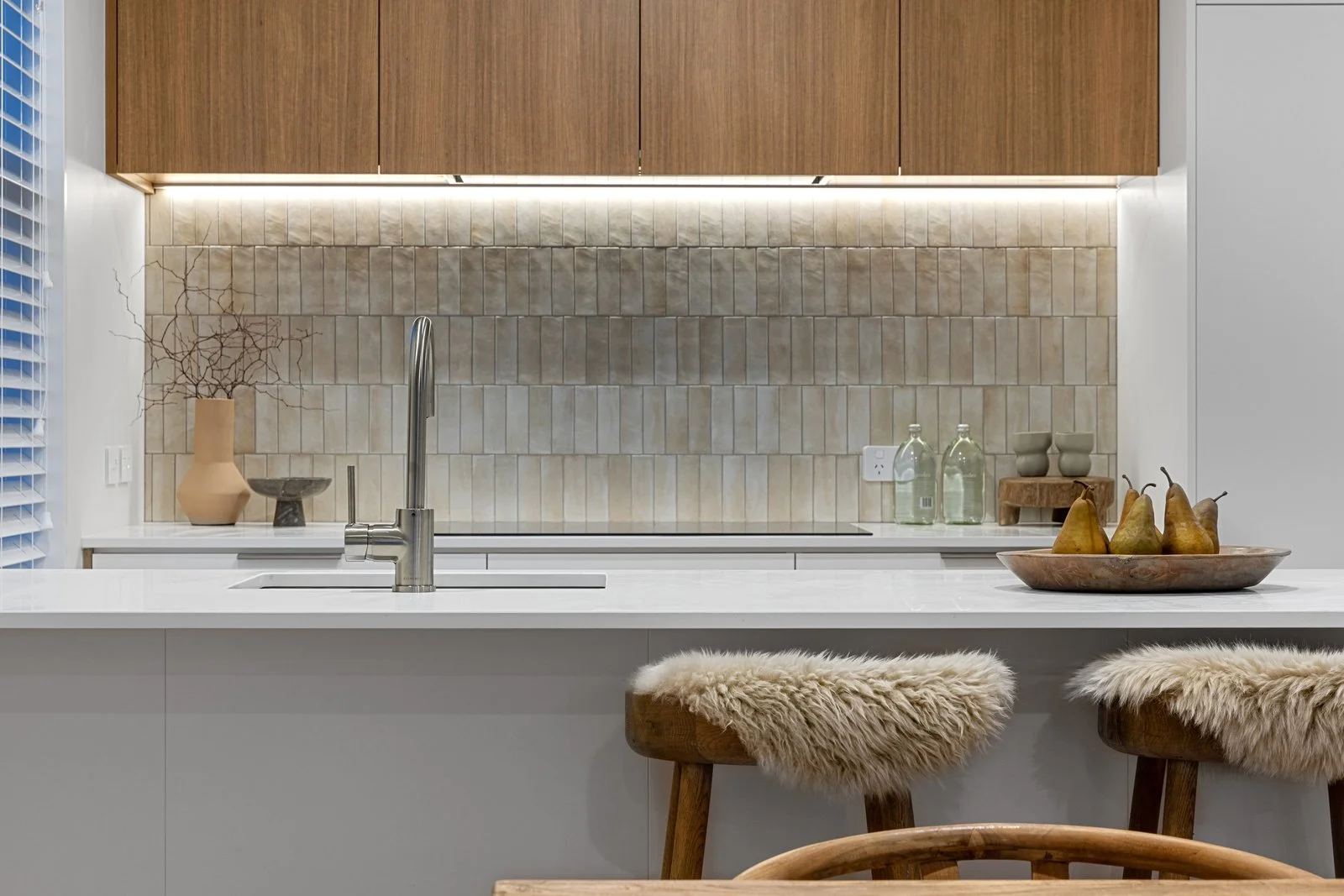 Designer kitchens with stainless steel look formica bench top, white subway tile splash back, two toned cabinetry and Fisher and Paykel appliances